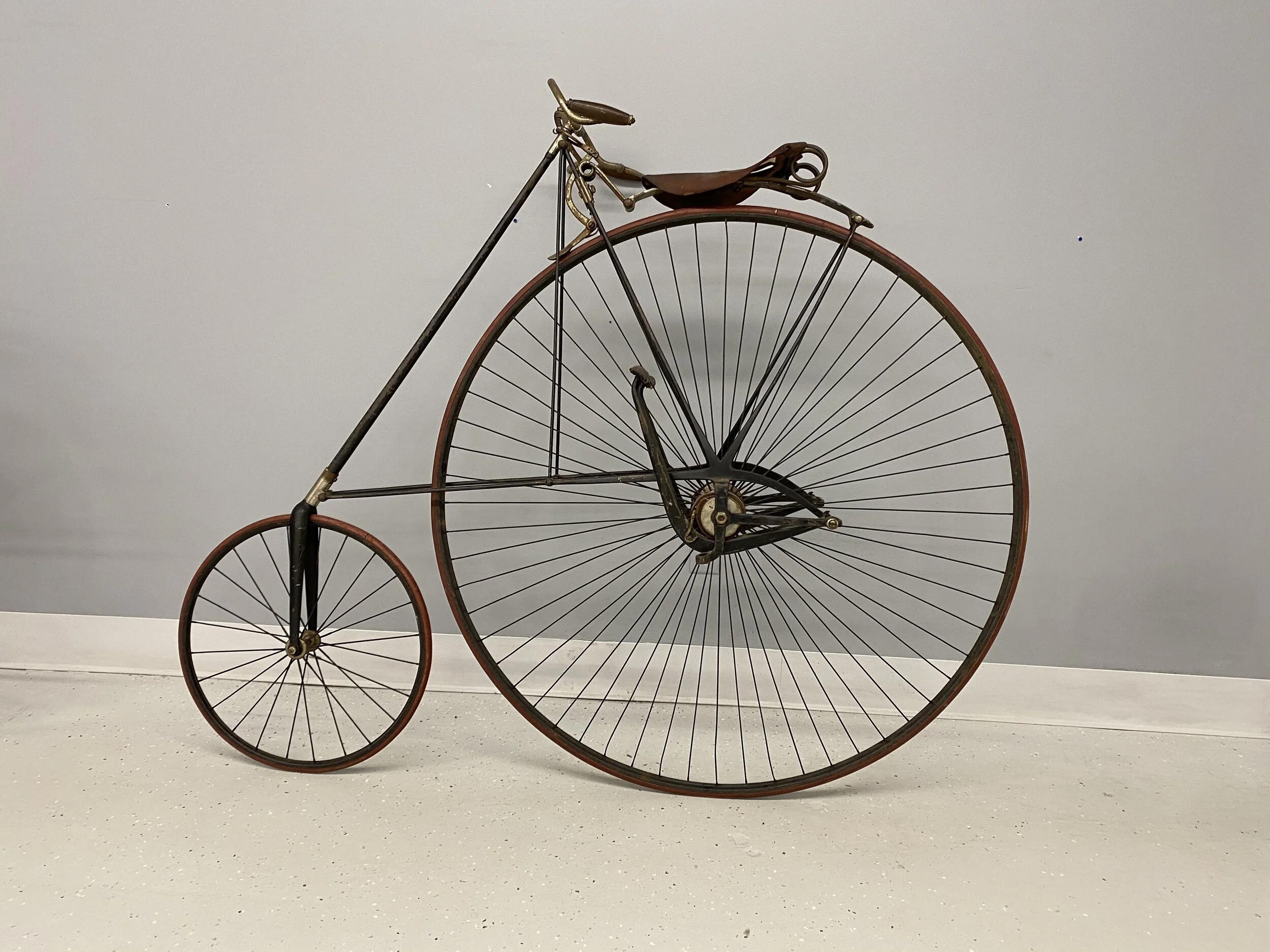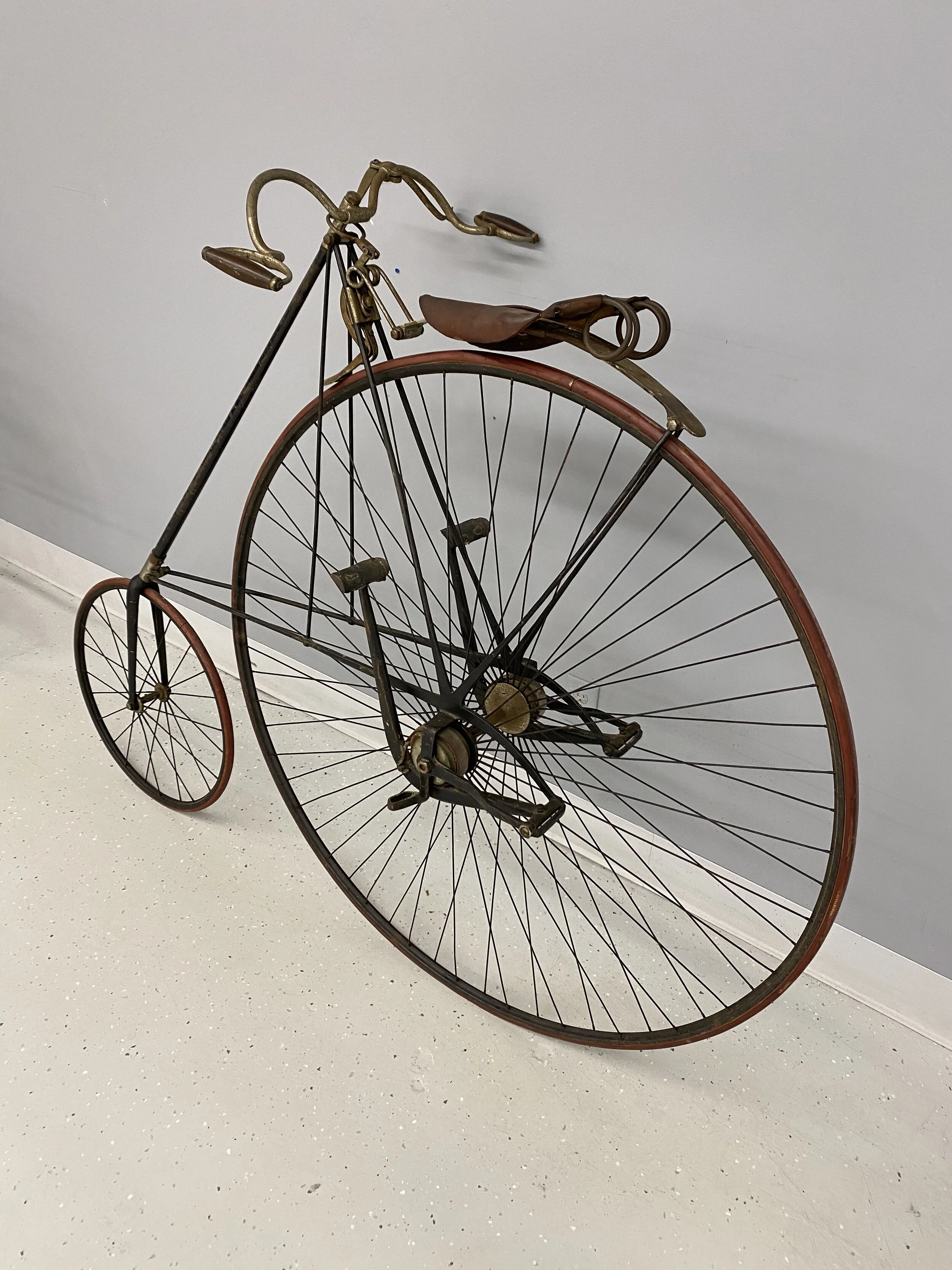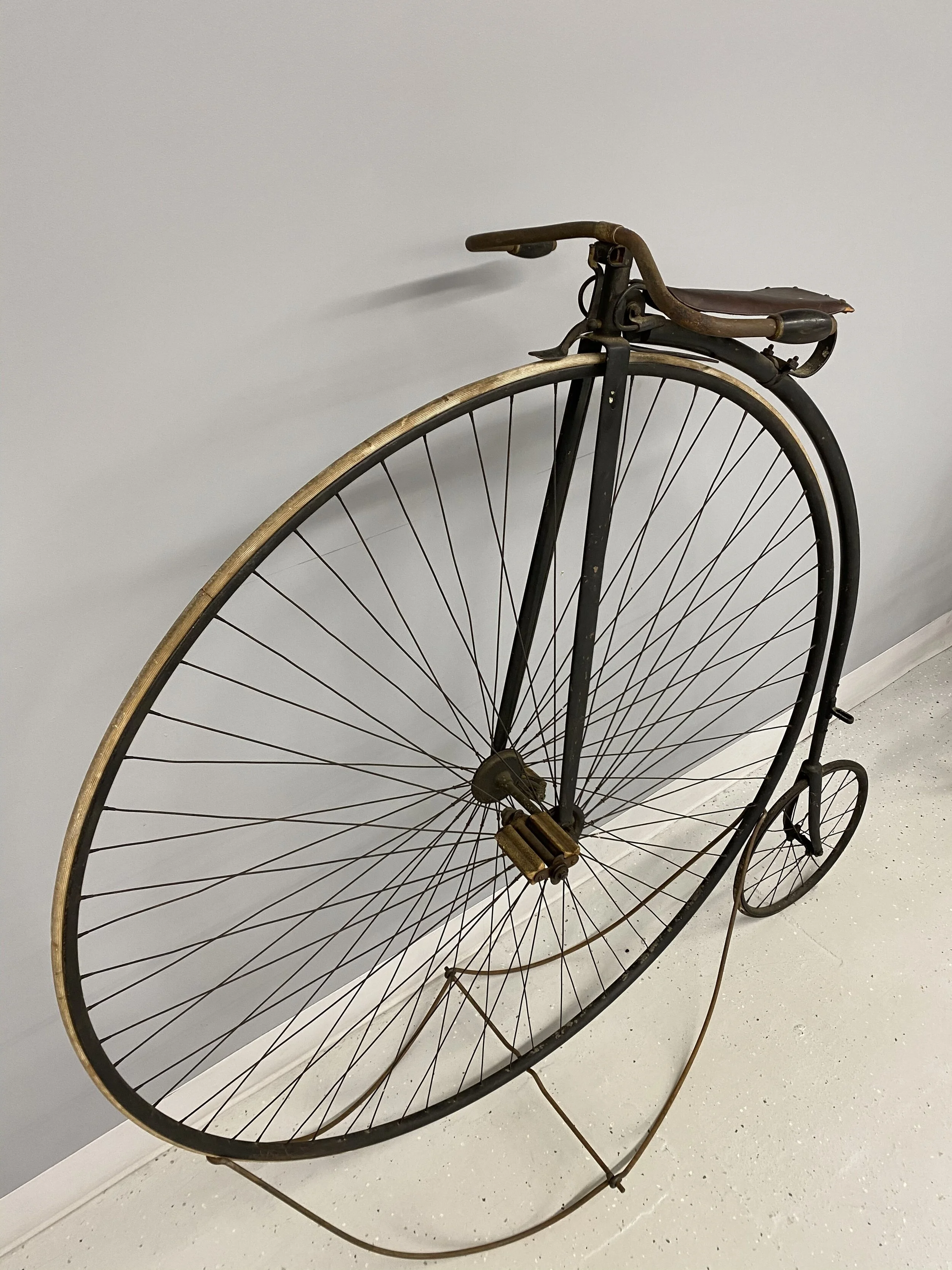 This imposing bicycle is the tallest of the high wheelers and was set up for racing.