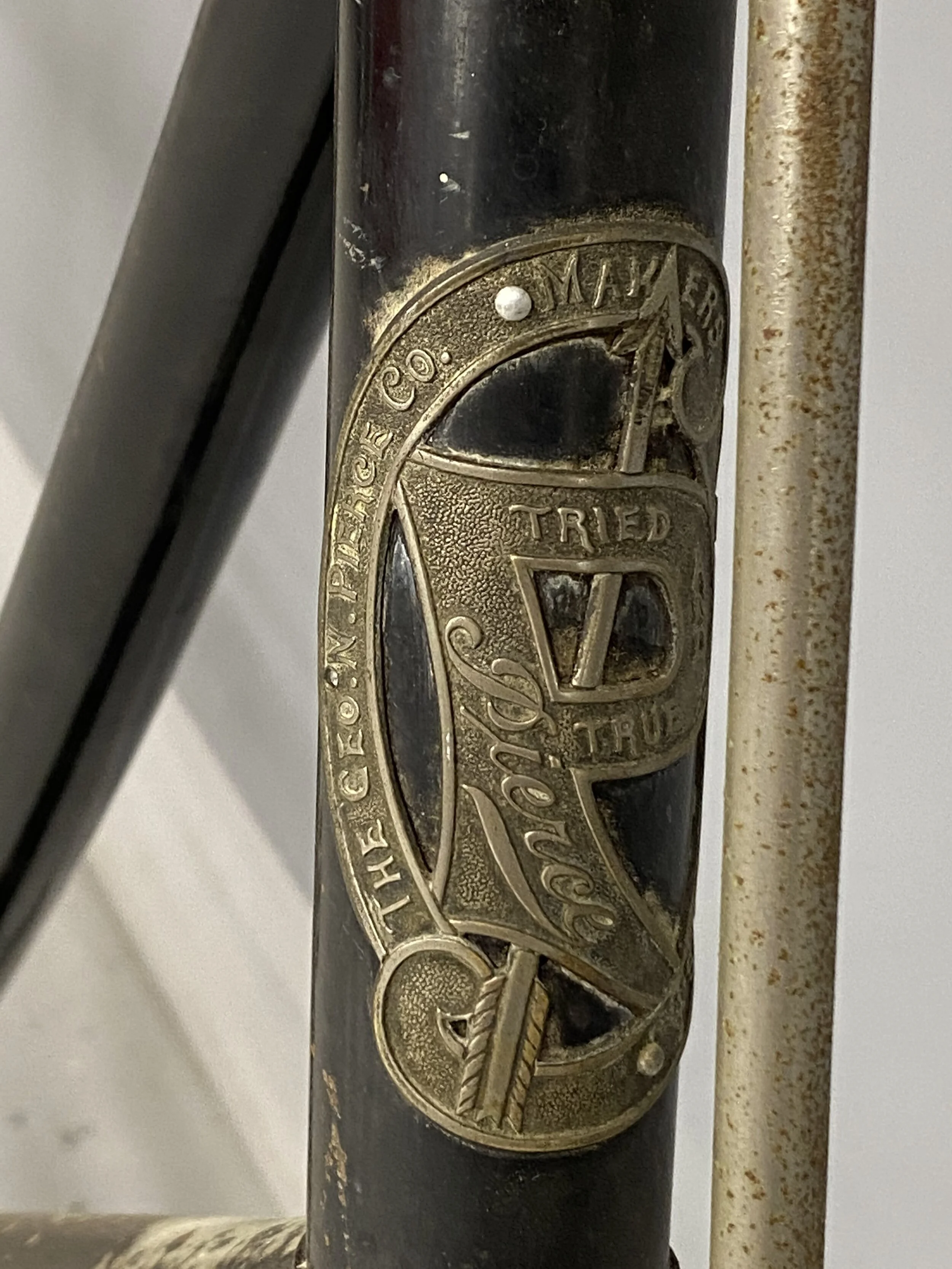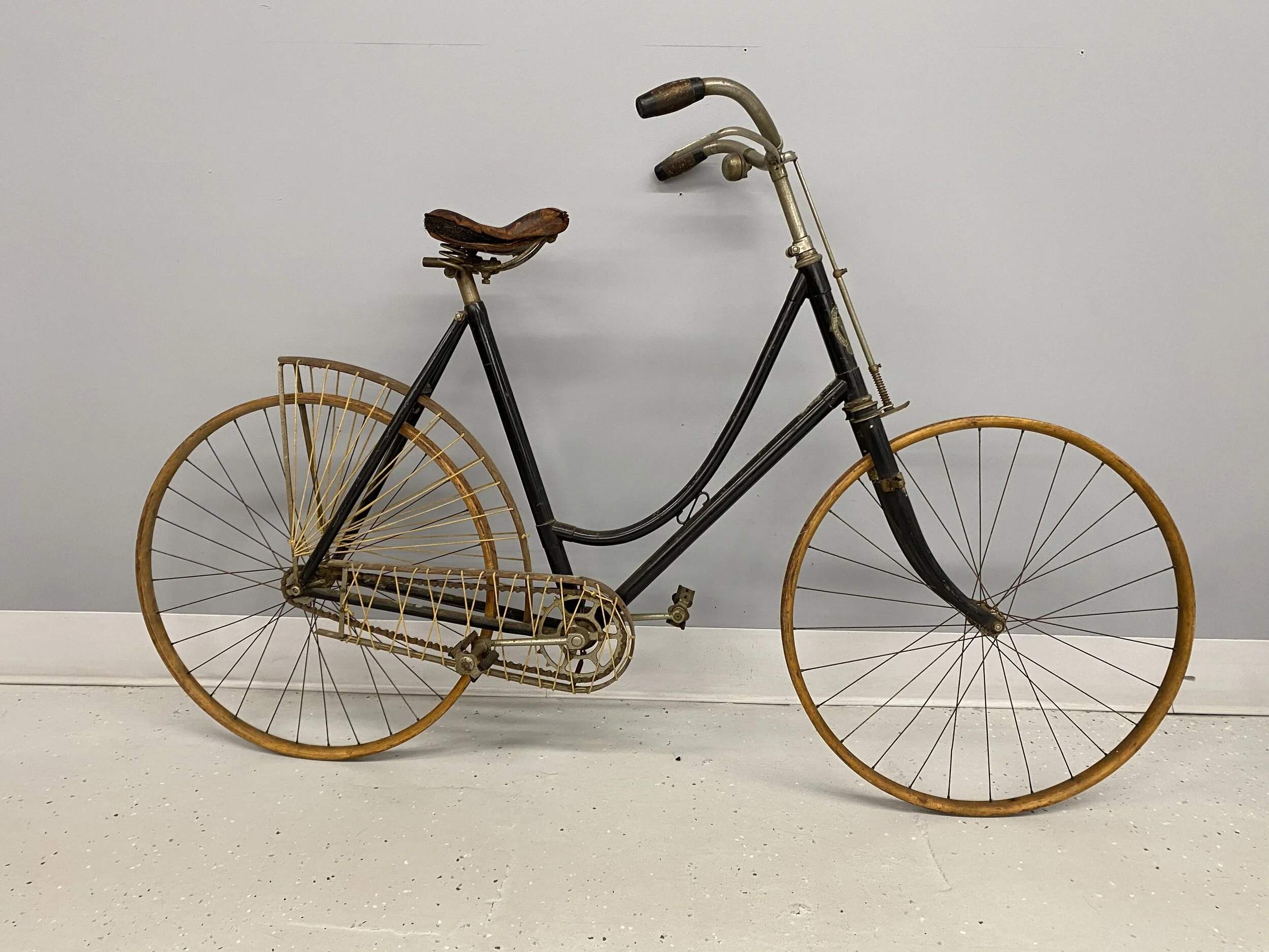 This Pierce Cycle safety bicycle is an unrestored example of their premier women’s bicycle model with Cushion-Frame. The “ladies and misses” bicycle cost $85 with 28-inch wheels and $10 more for “cushion tires”. Weighing less than 25 pounds, with seamless tubing, the sales catalog states the company has made “a substantial advance toward the perfecting of twentieth century steed, the modern bicycle”.