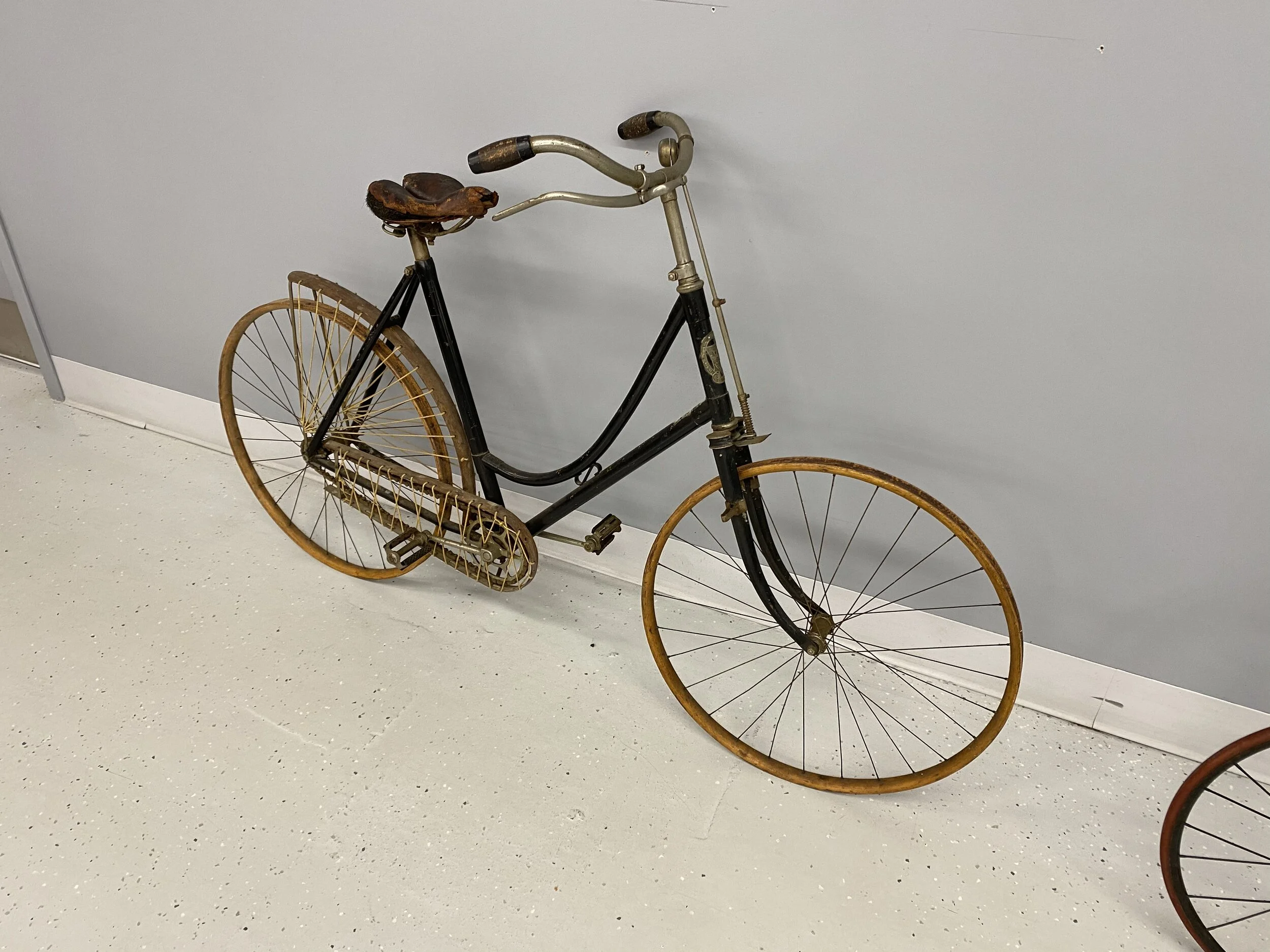 On loan from the collection of Charles & Aline LeMaitre, Hardwick, MA This French made 1880s velocipede is a refinement of 1860s all wood frame & wheels with 38.5” iron tire in the front. “Bone Shaker” nicknamed given its harsh riding characteristics. The frame is made of cast iron, with an iron leaf-spring seat support. The “wagon wheels” are still of wood with iron band tires. This design proceeds the high wheeler with was much faster given the larger diameter direct drive front wheel.